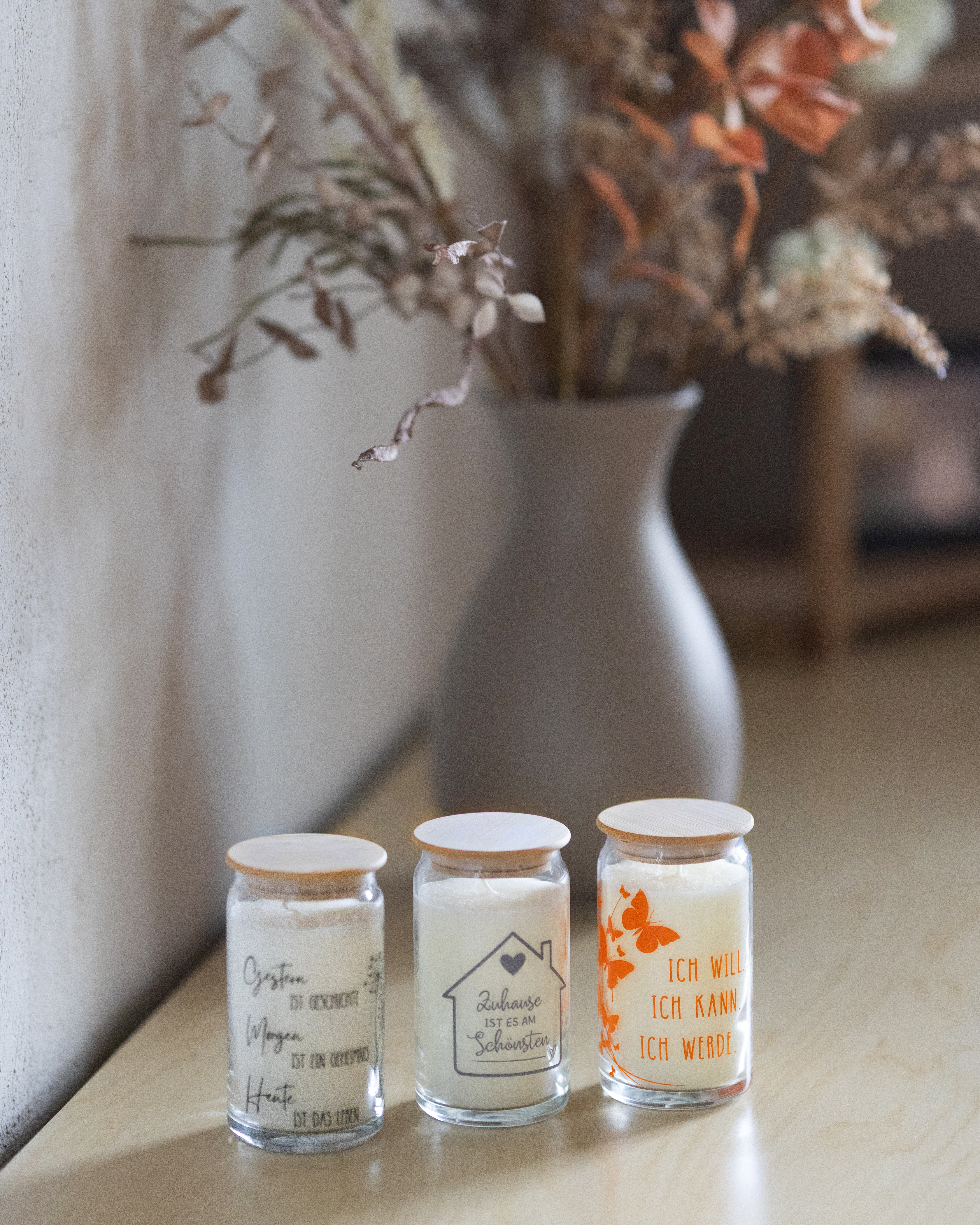 Bedruckte Zylindergläser und ein natürlicher Holzdeckel machen jede Kerze zu einem stilvollen Blickfang. Die liebevoll gestalteten Motive und fein abgestimmten Düfte schenken jeder Motivkerze eine individuelle Note. Die Motivkerzen eignen sich hervorragend als stilvolles Geschenk für Freunde, Familie oder sich selbst. Die Brenndauer beträgt etwa 65 Stunden.