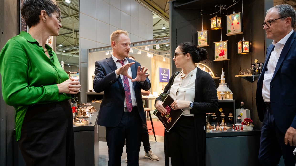 Die Städtepartnerschaft zwischen Seiffen und Carmel bietet nicht nur eine wirtschaftliche Perspektive, sondern auch eine Chance, das Handwerk international bekannter zu machen. Bei ihrem Rundgang durch die CADEAUX Leipzig zeigt Frederic Günther der US-Konsulin die beeindruckenden Gesellenstücke der Nachwuchshandwerker und erklärt, wie die Ausbildung im Erzgebirge organisiert ist.